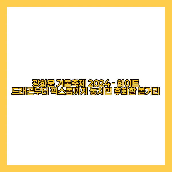 2024년 광화문 겨울축제가 곧 시작됩니다. 이번 축제는 화이트 드래곤의 환상적인 퍼포먼스와 픽스몹과 함께하는 독특한 체험으로 관람객들의 기대를 모으고 있습니다. 방문객들은 매력적인 볼거리를 통해 잊지 못할 겨울 추억을 쌓을 수 있는 기회를 가질 것입니다. 다양한 즐길 거리와 먹거리가 마련된 만큼, 가족, 친구와 함께 이 특별한 축제를 만끽해보시기 바랍니다. 놓치면 후회할 이번 겨울축제의 매력을 미리 알아보는 것은 필수입니다.