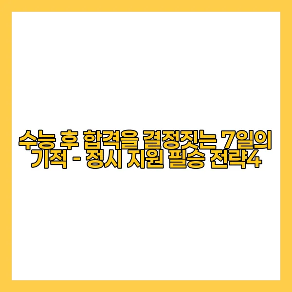 수능 후 합격을 결정짓는 7일의 기적은 중요한 시기입니다. 이 기간 동안 학생들은 정시 지원을 위해 필승 전략을 세워야 합니다. 마지막 점검 목록을 통해 필요한 사항을 확인하고, 정시 지원 전 체크해야 할 사항을 철저히 점검하는 것이 중요합니다. 또한, 효과적인 학습 시간 관리 방법을 통해 남은 일주일을 최대한 활용해야 합니다. 마지막으로, 강력한 자기소개서를 작성하는 요령을 숙지함으로써 자신을 더욱 돋보이게 할 수 있습니다. 학생 여러분의 성공적인 합격을 기원합니다.