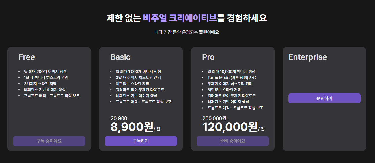 무료 구독으로 월 최대 200개 이미지 생성 테스트를 해볼 수 있다.