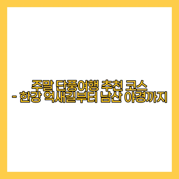 이번 주말, 자연이 선사하는 아름다운 단풍을 만끽하는 여행을 계획해 보세요. 한강 억새길에서의 선선한 바람과 가을의 정취는 스트레스를 잊게 해 주며, 남산의 야경은 특별한 감동을 선사합니다. 다양한 단풍 명소가 여러분을 기다리고 있습니다니, 클릭 한 번으로 가을의 매력을 체험해 보시기 바랍니다. 준비물과 꿀팁을 잊지 마세요. 당신의 가을 여행이 더욱 빛나는 순간이 될 것입니다. 지금 즉시 이 아름다운 여정을 시작해 보세요.