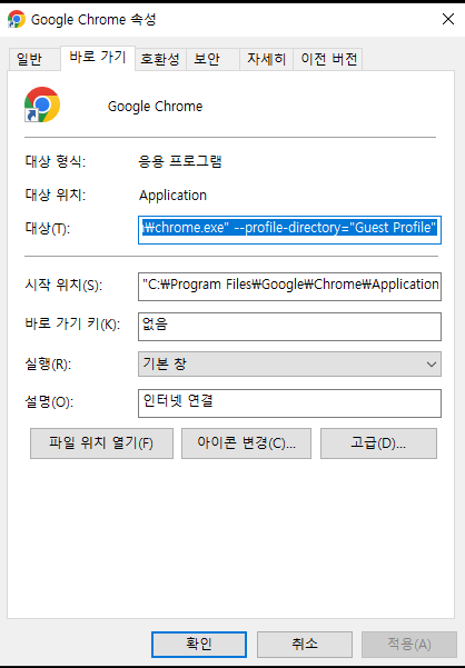 속성 창을 열어.. chrome.exe" 뒷부분에 아래와 같이 추가해주세요.