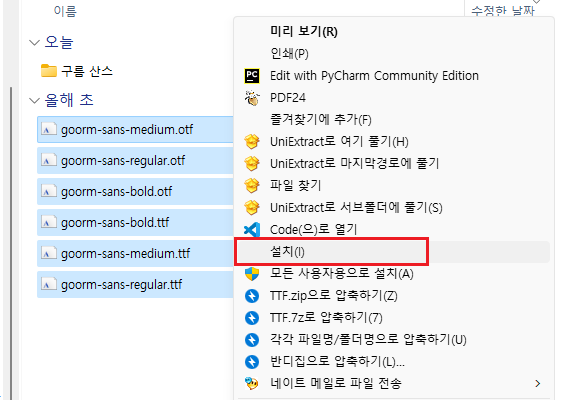 다운로드 받은 폰트 파일들을 선택한 후,