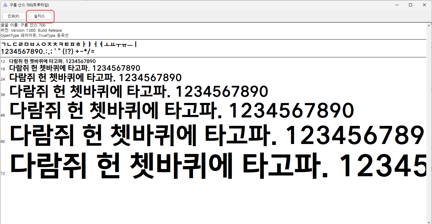 폰트를 설치할 수 있는 "설치" 버튼을 보여집니다.