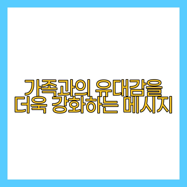 마지막으로 가족과의 유대감을 더욱 강화하기 위해선 '감사'를 표현하는 것도 무척 중요합니다. "너와 함께해서 진짜 행복해!"라거나 "내 곁에 항상 있어줘서 고마워!"와 같은 표현은 서로의 존재 가치를 다시금 느끼게 해주는 역할을 할 수 있습니다. 감사의 메시지는 상대방에게 긍정적인 영향과 더불어 자신 또한 기분이 좋아지는 순간을 만들어 줍니다.