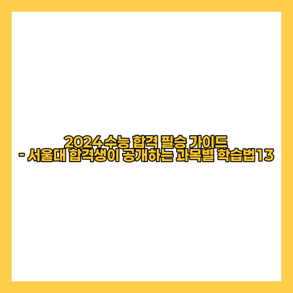 2024 수능 합격을 향한 여정을 시작하는 모든 학생 여러분께, 본 글에서는 서울대 합격생이 추천하는 과목별 학습법을 소개하겠습니다. 각 과목은 고유한 특성과 학습 방식이 필요하므로, 전략적인 접근이 필수적입니다. 또한, 효율적인 시간 관리와 실전 문제 풀이의 중요성도 간과해선 안 됩니다. 이러한 요소들이 조화를 이루어야만 멘탈 관리와 자기 관리에 있어서도 긍정적인 결과를 가져올 수 있습니다. 여러분의 성공적인 수능 준비를 위한 필승 가이드를 통해, 더욱 확고한 목표를 세워보세요.
