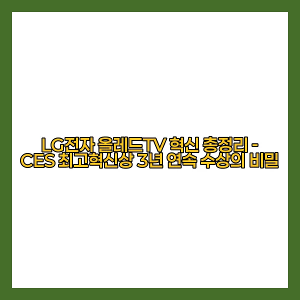 LG전자는 매년 CES(Consumer Electronics Show)에서 독보적인 기술 혁신을 선보이며 업계를 리드하고 있습니다. 특히, 올레드TV는 2021년부터 2023년까지 3년 연속 CES 최고 혁신상을 수상하며 그 경쟁력을 입증했습니다. 이 상은 소비자 전자제품 분야에서 가장 권위 있는 상으로 인정받고 있으며, LG전자의 올레드TV 기술이 어떻게 이룩된 것인지 살펴보는 것은 매우 흥미로운 일입니다! 😊