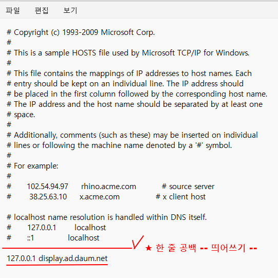 3. hosts 파일 → 가장 하단에 “127.0.0.1 display.ad.daum.net” 입력해 넣기 → 저장